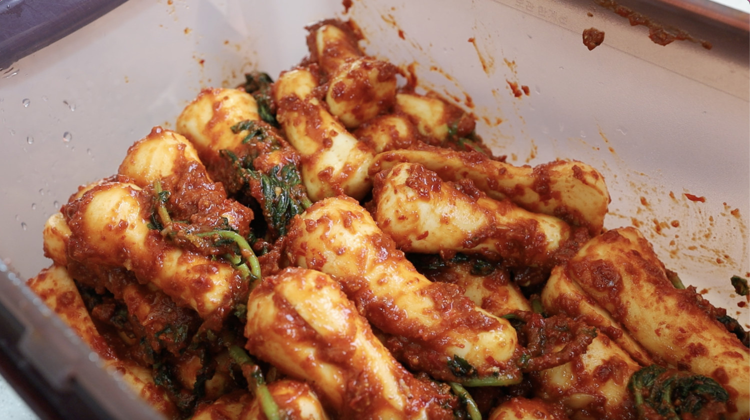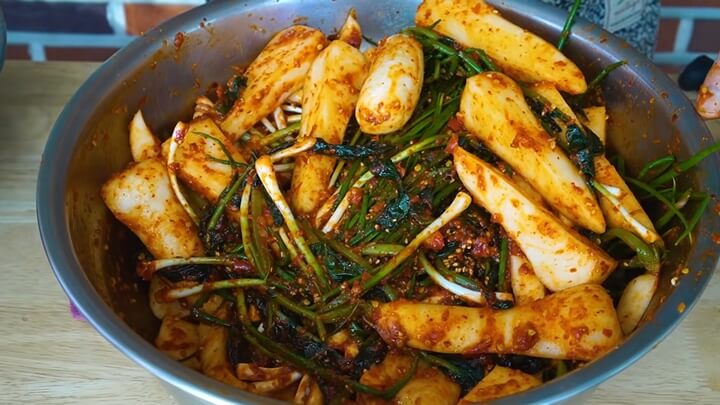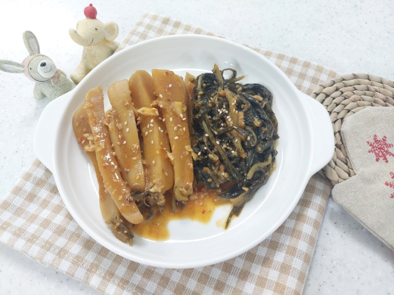 양념이 고르게 무에 달라붙고 깊은 맛을 내기 위해 찹쌀풀을 사용합니다.