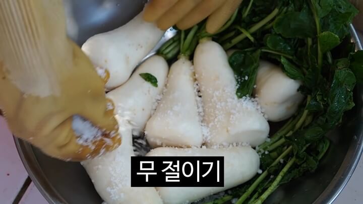 4️⃣ 무가 살짝 휘어지고 잎이 부드러워지면 잘 절여진 상태입니다.