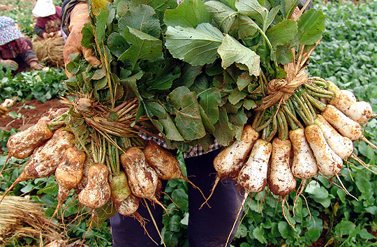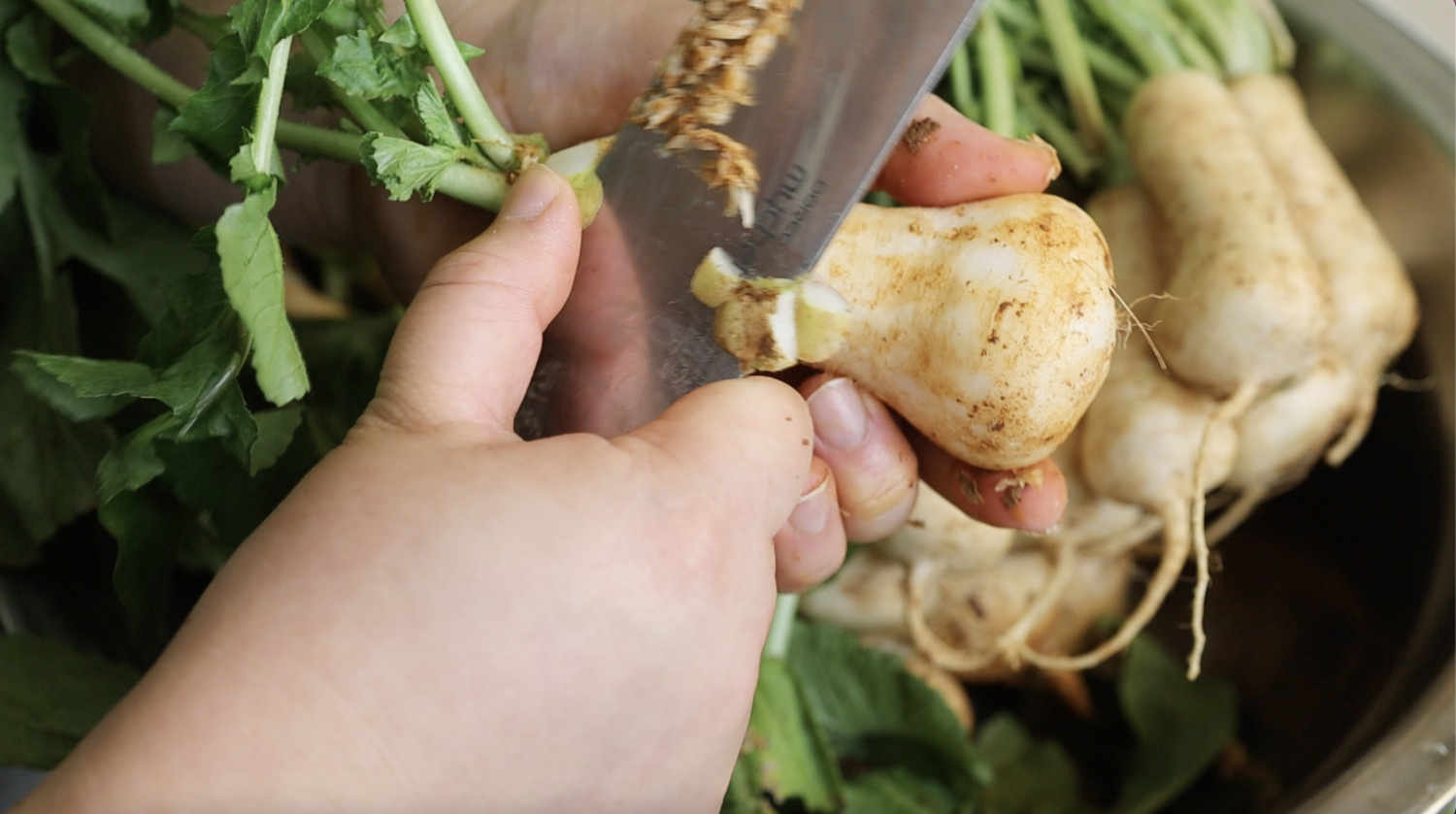- 무 표면의 흙은 솔로 문질러 깨끗이 씻습니다.