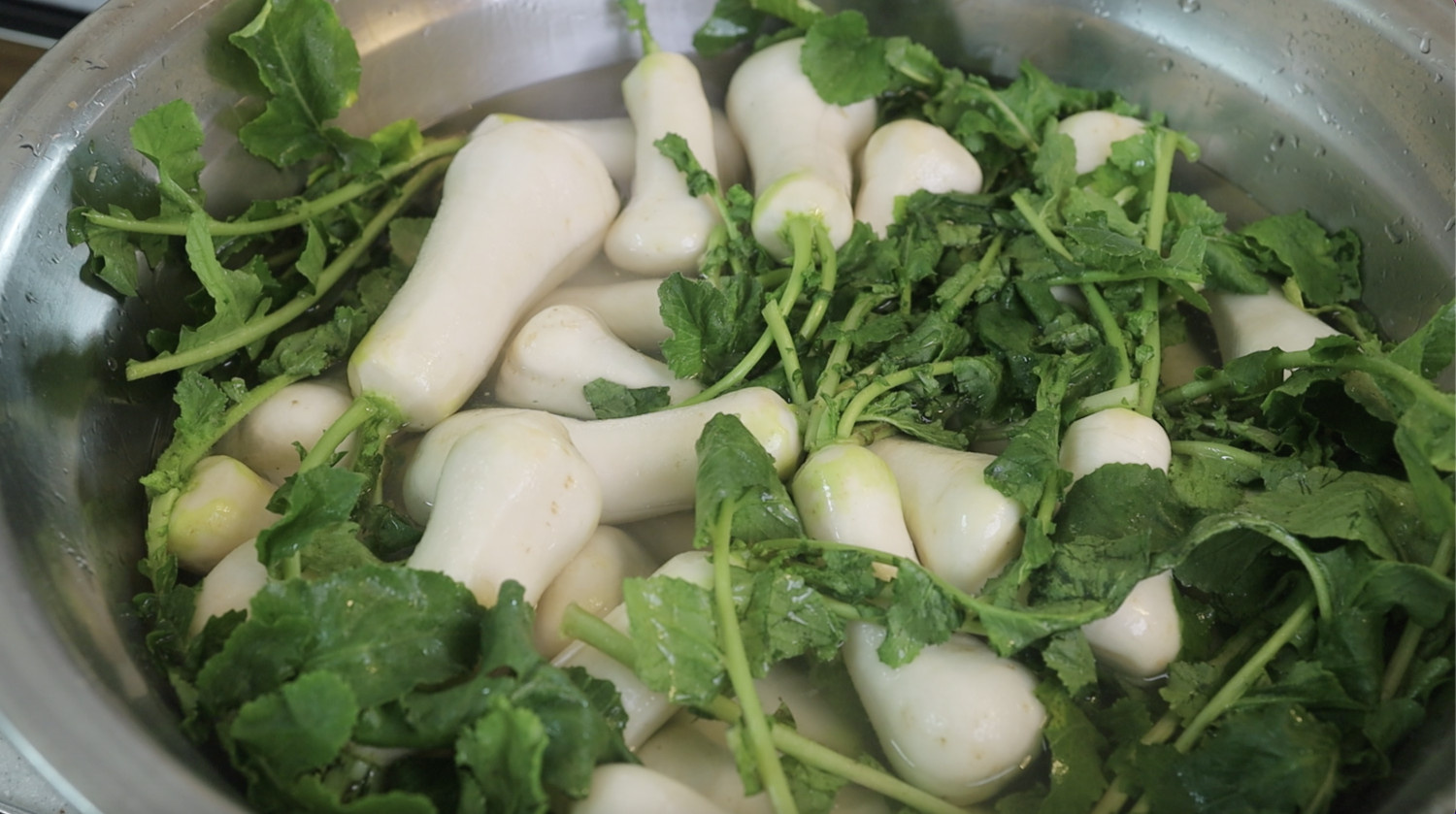 1️⃣ 물기 뺀 알타리무를 큰 대야에 담습니다.