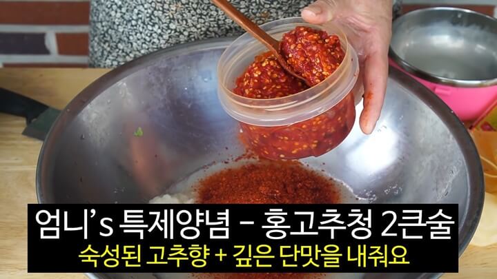 고춧가루를 넣은 뒤 10분 정도 두면 색이 고와지고 맛이 안정됩니다.