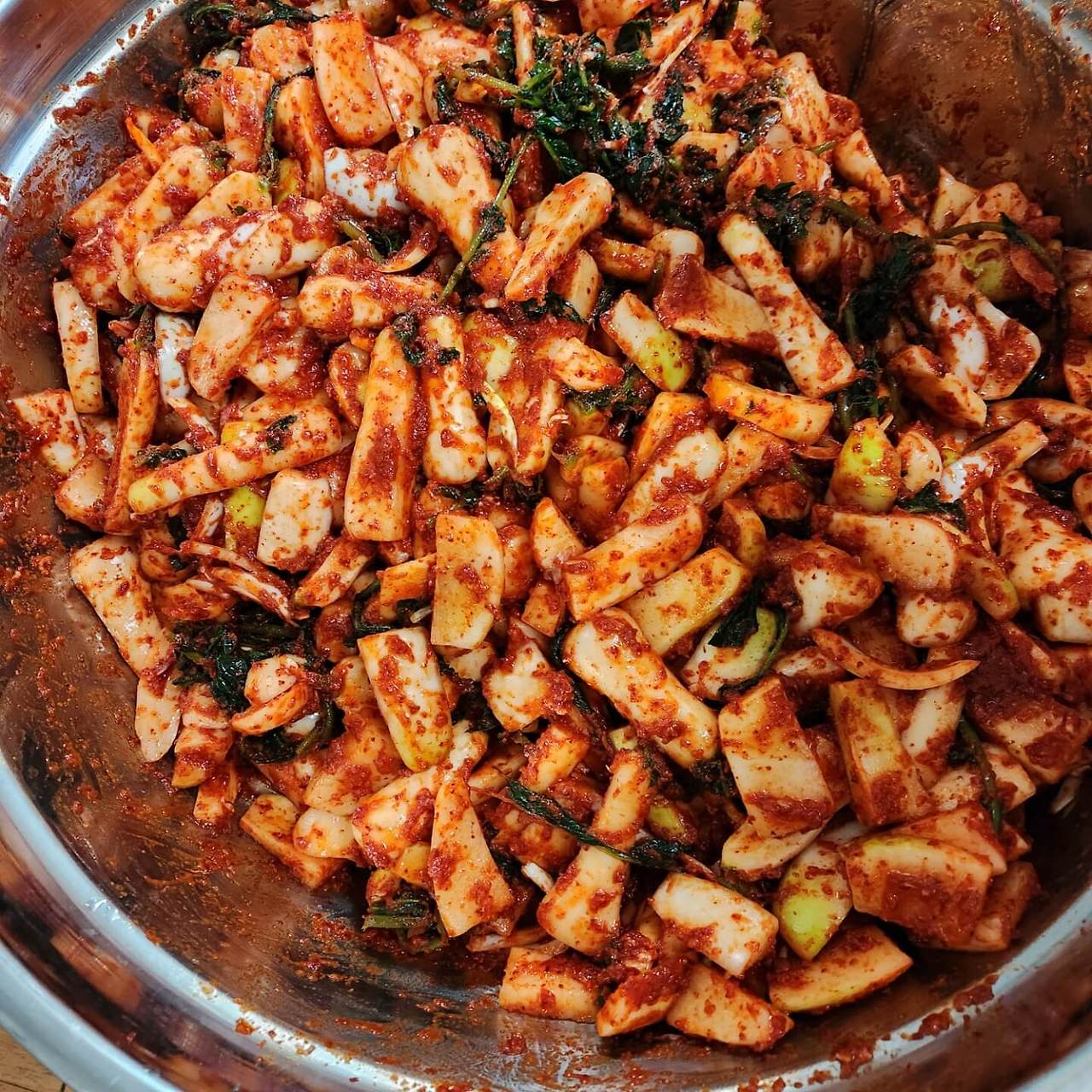 💡 포인트: 무와 양념이 완전히 섞이면 색이 고르게 붉어지고,